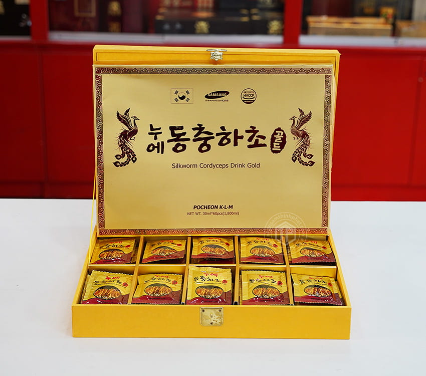 - Ngoài ra, hộp vàng 60 gói nước đông trùng hạ thảo Hàn Quốc có thiết kế đóng hộp sang trọng và dạng gói tiện lợi. Đây là món quà có giá trị đặc biệt, thích hợp để tặng cho người thân trong các dịp lễ tết, mang theo ý nghĩa đặc biệt.