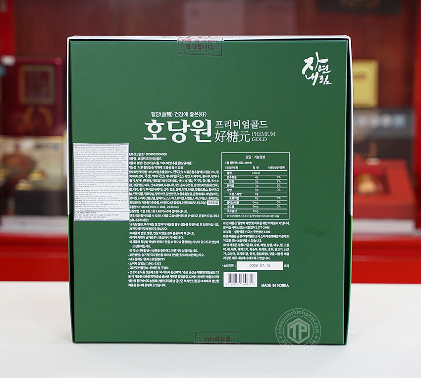 ✔ Mỗi túi (70ml) chứa: Chiết xuất lá cây bằng lăng (Lagerstroemia speciosa L.) (1% acid corosolic, Ấn Độ) 50mg, hỗn hợp chiết xuất thực vật [(hàm lượng rắn 3%, cúc vu (Jerusalem artichoke) (Hàn Quốc), mạch nha (Hàn Quốc), lá tre (Bambusa arundinaceaetz.) (Hàn Quốc), sa nhân (Amomum longiligulare), rễ ngải cứu đỏ (Artemisia vulgaris), dâu tằm (Morus acidosa Griff.), thân cây khúng khéng (Hovenia dulcis Thunb), quả khúng khéng (Hovenia dulcis Thunb), rau xà lách (Lactuca sativa L.), sơn tra (Malus doumeri (Bois.) A. Chev.), đại hoàng (Rheum officinale Baill.), kỷ tử (Lycium chinense Mill.), giá đỗ, râu ngô (Zea mays L.), vỏ quýt (Citrus reticulata Blanco), mướp đắng (Momordica charantia L.), quả dành dành (Gardenia jasminoides Rllis), quả bách xù (Juniperus chinensis L.), vỏ cây du đỏ (Ulmus rubra), long nhãn (Euphoria longan (Lour.) Steud.), cỏ cà ri (Trigonella foenum-graecum), táo tàu (Zizyphus jujuba Lamk.), hoàng kỳ (Astragalus membranaceu (Fisch.) Bunge), hạt củ cải (Raphanus sativus L.var.longipinnatus Bail.), sơn trà (Docynia indica (Wall.) Decne), cam thảo (Glycyrrhiza uralensis Fisch.), bạch chỉ (Angelica dahurica (Fisch.ẽ Hoffm.) Benth.et Hook.f), mẫu đơn (Paenonia suffruticosa Andr.), giần sàng (Cnidium monnieri (L.) Cuss.)], magie sulfat, kali carbonat, canxi clorua, kẽm sulfat, mangan sulfat, bột chiết xuất nhung hươu (Cervus spp.), hỗn hợp acid amin (L- Phenylalanine, L-leucine, L-lysine hydrochloride, palatinose, L-isoleucine, L-valine, L-histidine, L-threonine, L-tryptophan), chiết xuất hạt bưởi (Citrus grandis (L.) Osbeck), hỗn hợp vitamin D3.