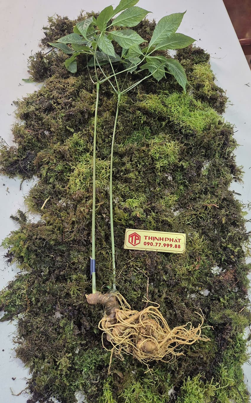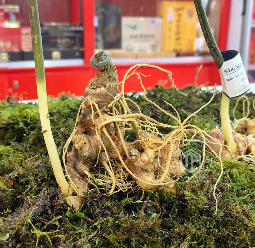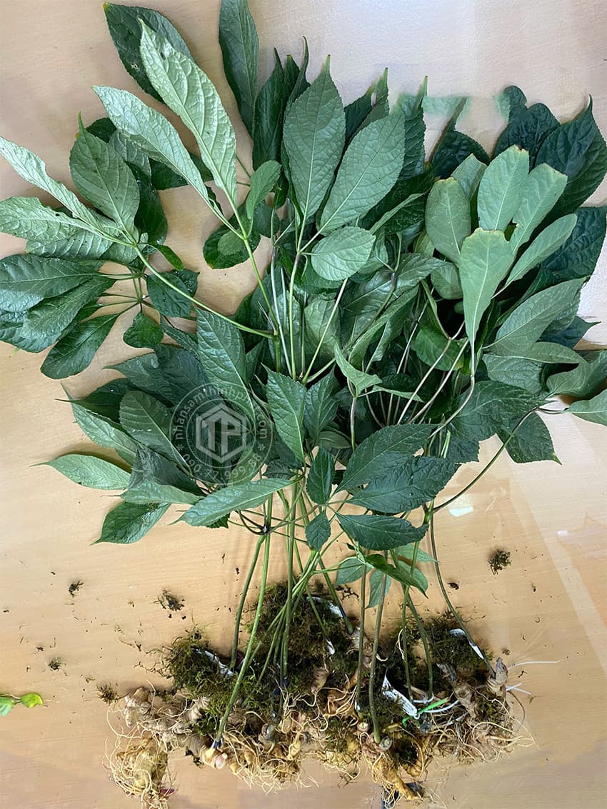 ➢ Sâm Ngọc Linh là loại cây thảo cao 80 – 100cm, thân rễ nằm ngang trên hoặc dưới mặt đất khoảng 1 – 3cm, mang rễ con và củ. Thân rễ có sẹo, nhiều đốt. Các thân mang lá; tương ứng với một thân mang lá là một đốt dài khoảng 0,5 – 0,7cm. Trên đỉnh của thân mang các lá mọc vòng, có 5 – 7 lá chét với phiến lá hình trứng ngược. Hoa mọc giữa các lá thẳng với thân. Quả dài từ 0,8 – 1,0cm, rộng khoảng 0,5 – 0,6cm, có màu đỏ khi chín. Cây mọc dưới tán rừng. Bộ phận dùng làm thuốc chủ yếu là thân, rễ củ. Cũng có thể sử dụng cả lá và rễ con. Nói chung phải chọn loại sâm có từ 7 – 8 tuổi mới sử dụng tốt. Người ta dựa vào sẹo trên thân rễ để tính tuổi của sâm; sâm trên thân rễ có trên 10 sẹo ước tính là trên 8 năm tuổi.